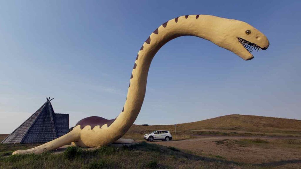 « Mo » a été construit pour commémorer la découverte des restes de ce reptile marin à 6 kilomètres au nord-est de Ponteix. Hauteur : 8 pieds 10 pouces (2,7 mètres) Longueur: 24 pieds (7,3 mètres). La plaque au pied du chemin menant à la statue indique: « Mo » Le plésiosaure de Ponteix (élasmosaure), un reptile marin ayant vécu il y a 70 millions d’années, atteignant une longueur de 38 pieds. « Mo » a été trouvé à l’origine à 6 km au nord-est de Ponteix, par Bob St. Cyr. Henri Liboiron a confirmé l’emplacement et, avec son collègue paléontologue, Tim Tokaryk, a exploité le site. Ce projet de reproduction du site original du Plésiosaure a été initié par Roland (Dick) Lemieux; l’architecte est Larry Piché.